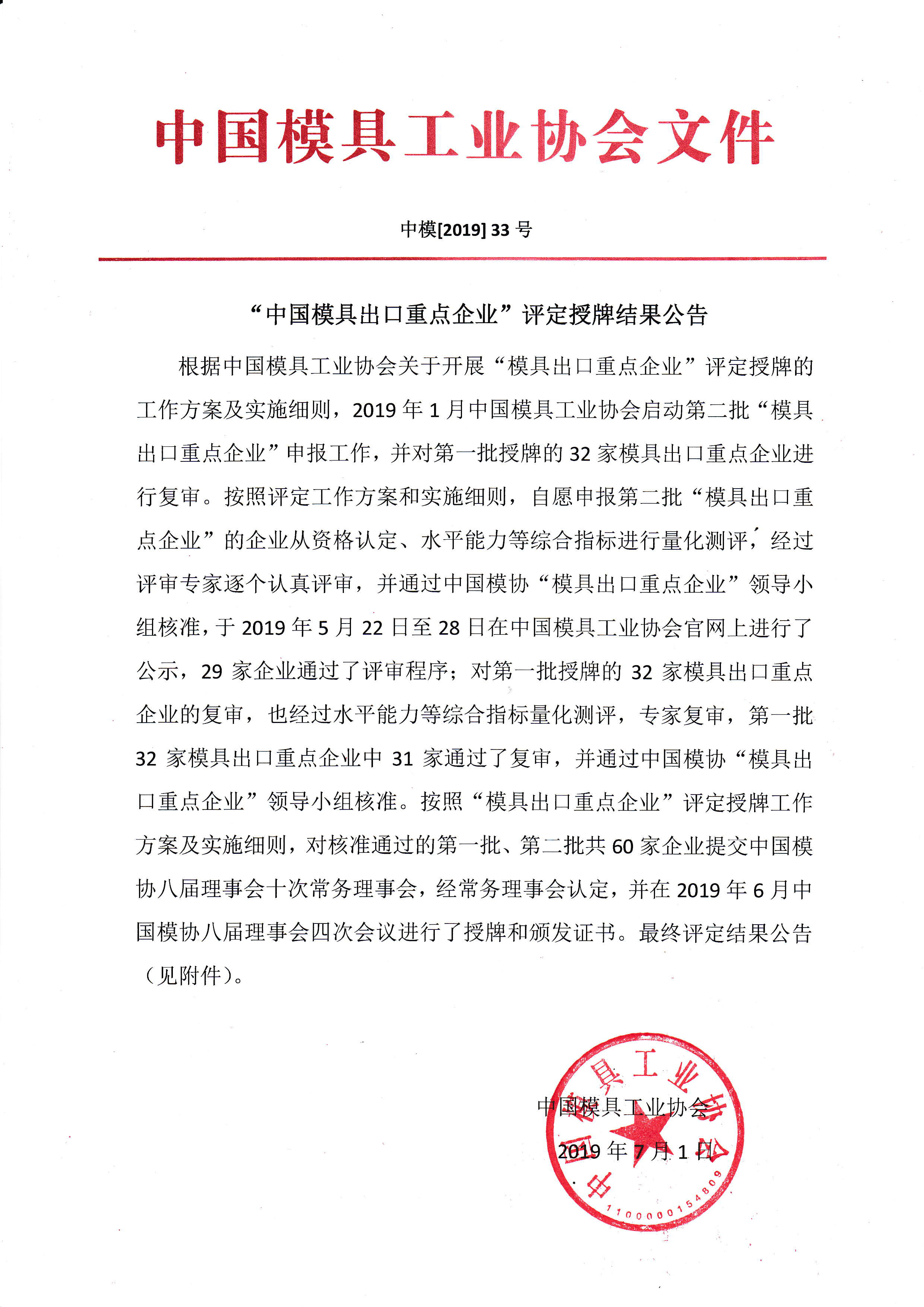 “中国模具出口重点企业”评定授牌结果公告 |